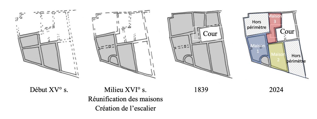 Des datations de bois ont permis de situer une grande transformation du bâtiment avec une réunification de 2 puis 3 maisons en un édifice commun.