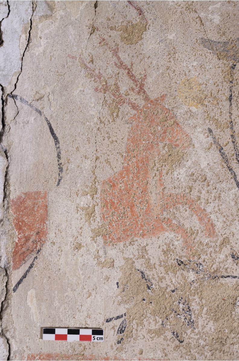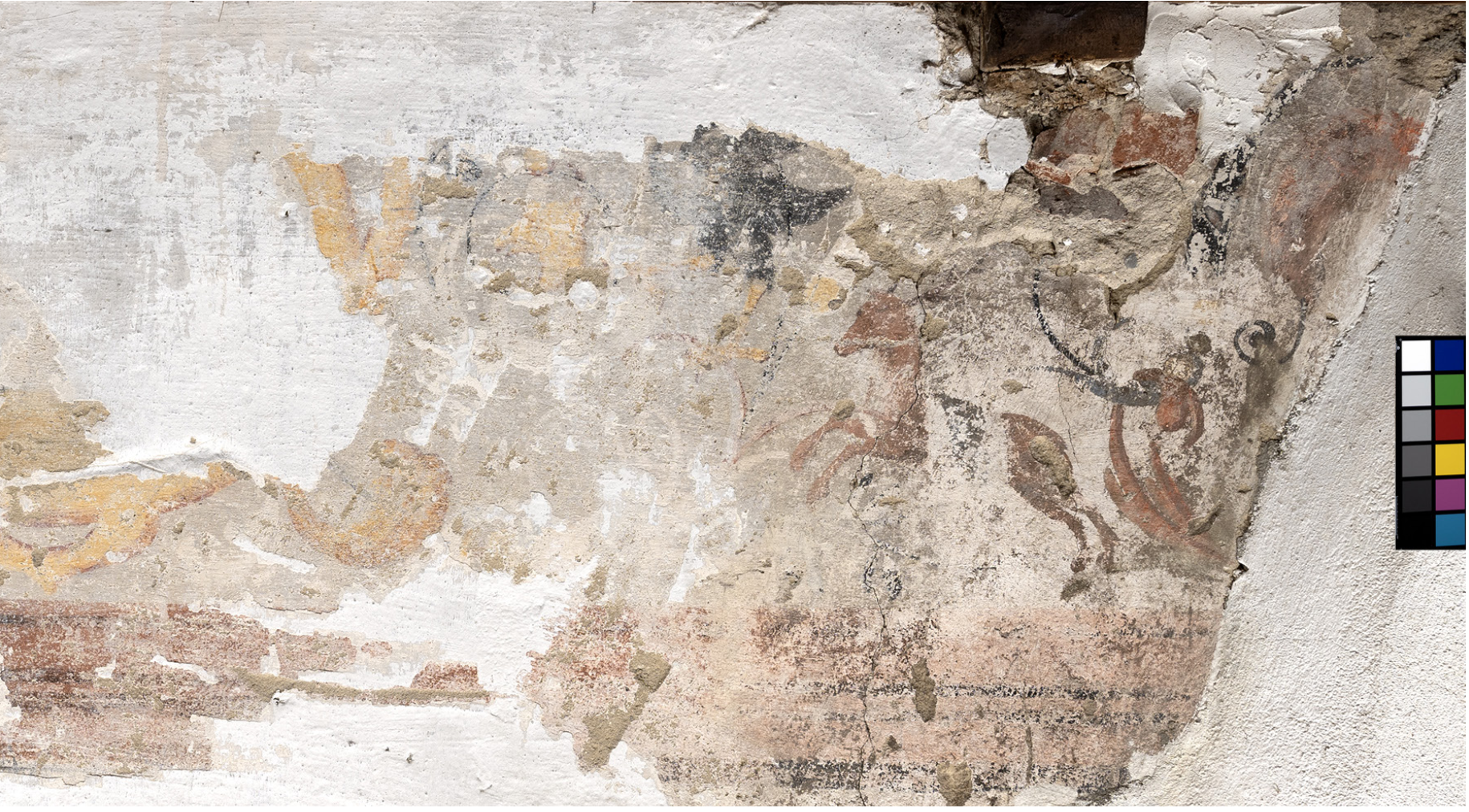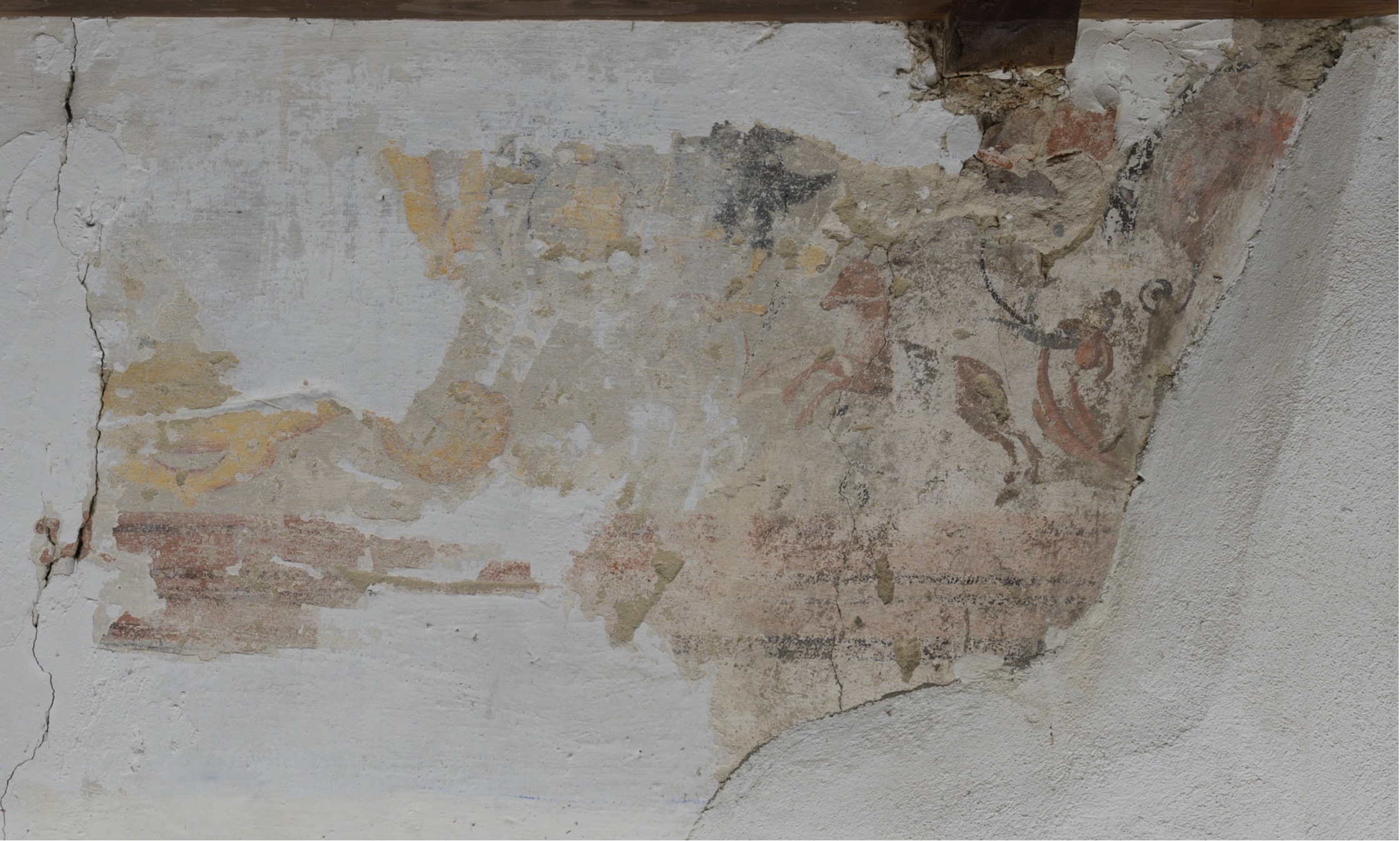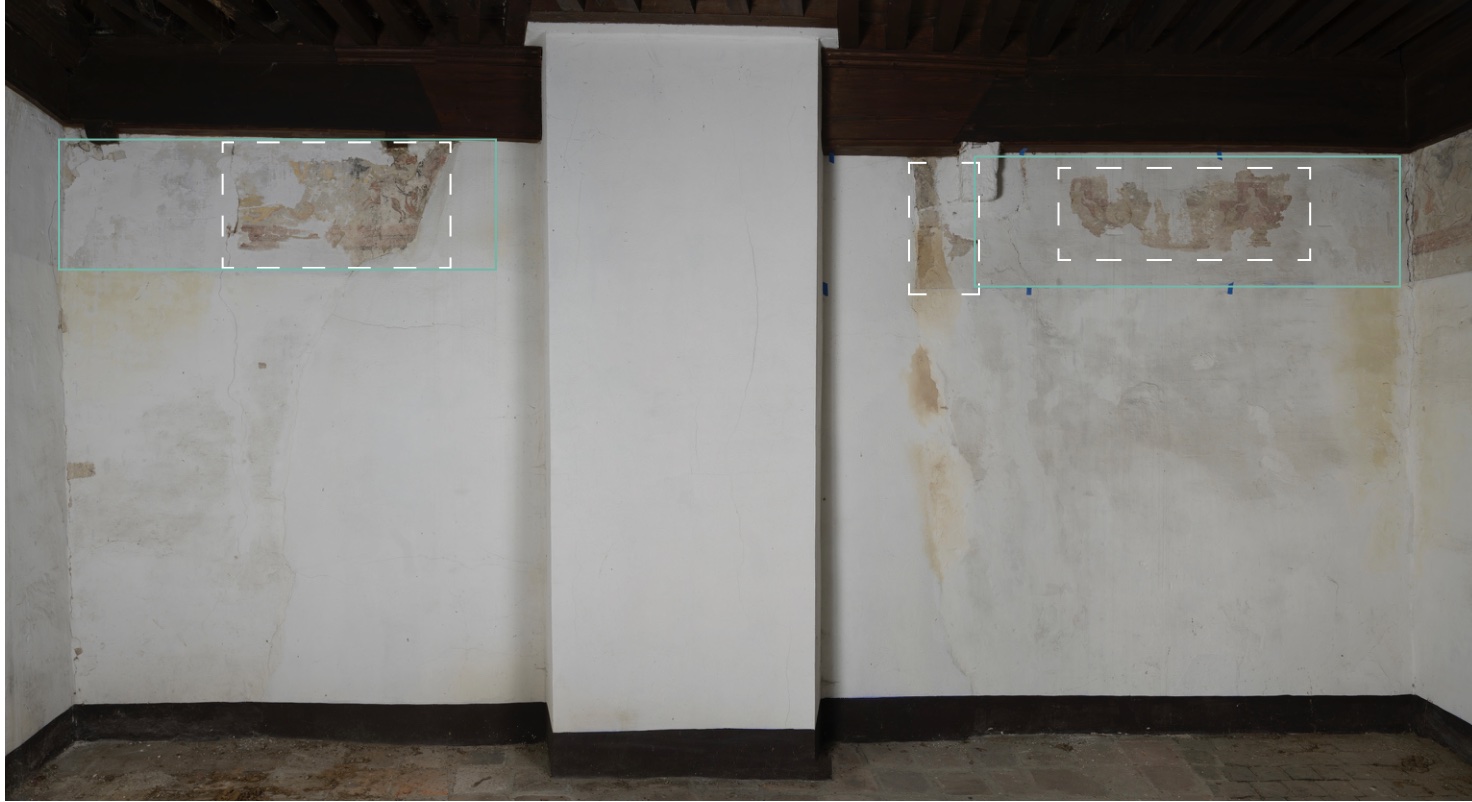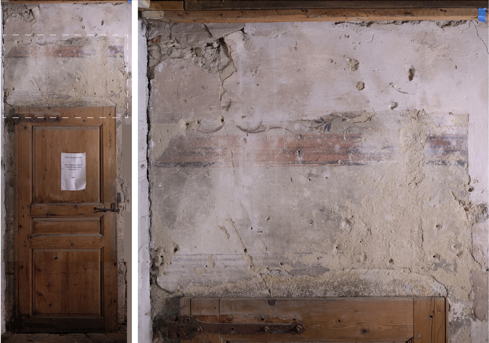 Découvert lors d’une opération d’analyse du bâtiment, sûrement avant 2016, le décor peint ceint toute la pièce du 2nd niveau du bâtiment classé monument historique.