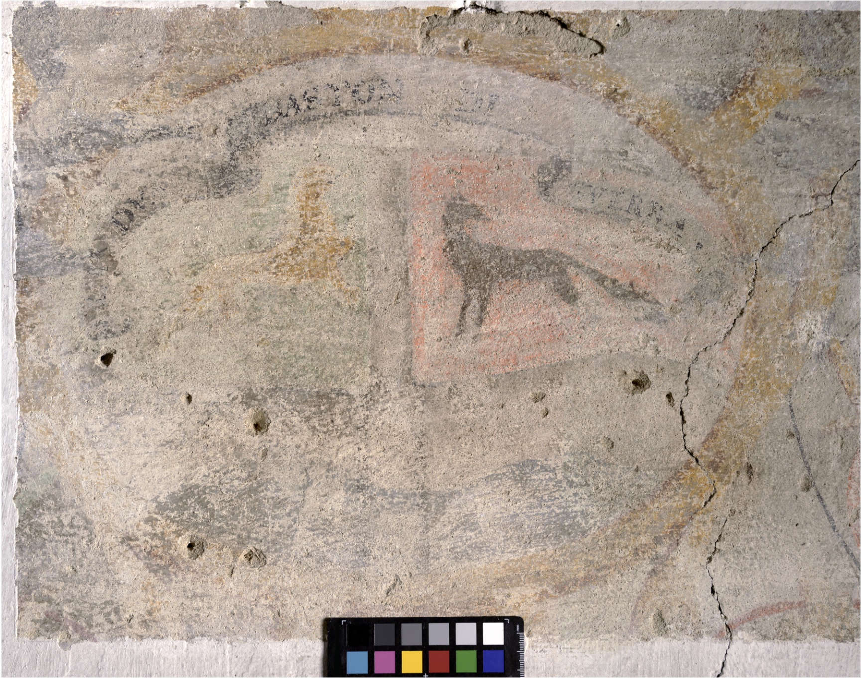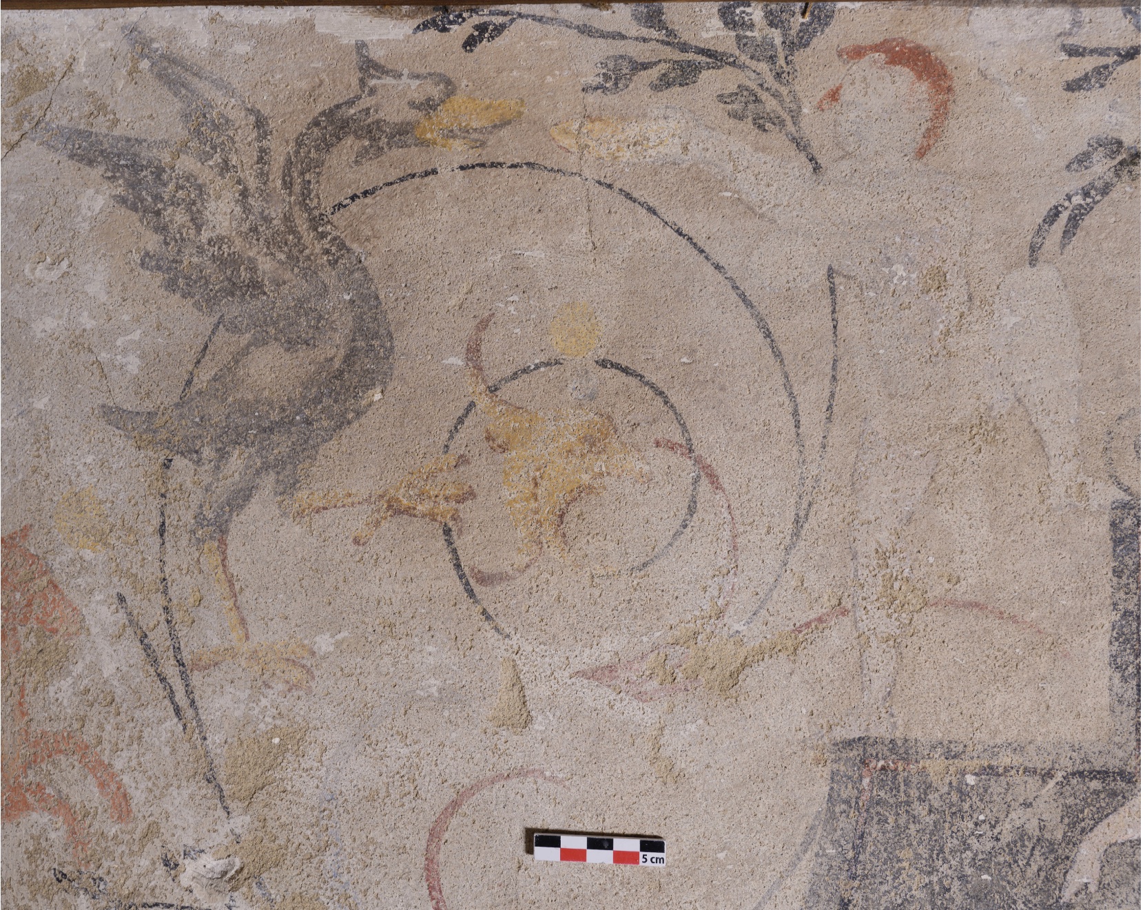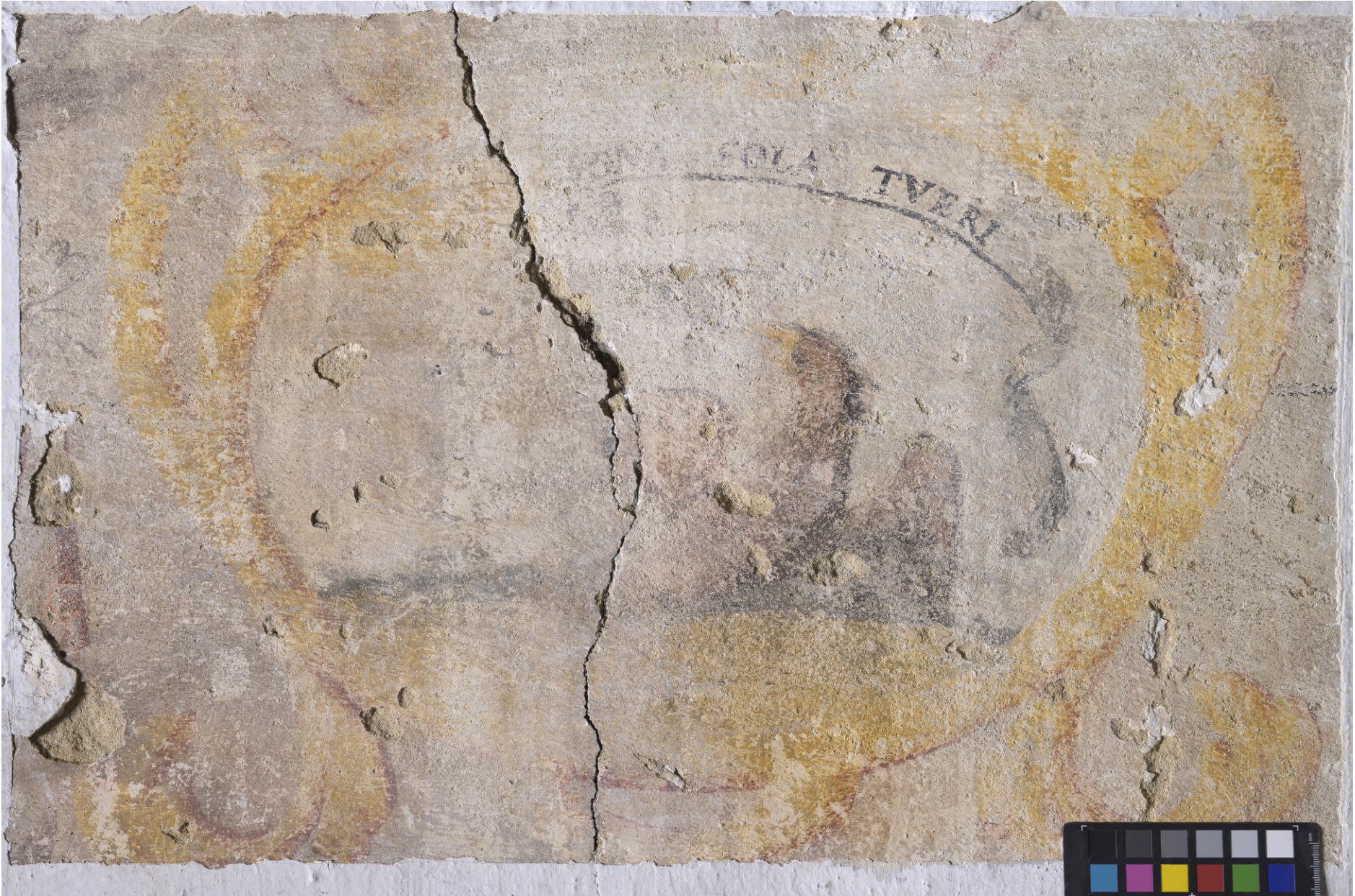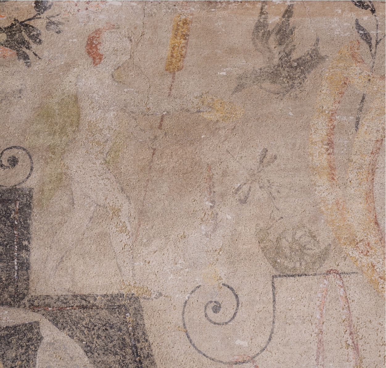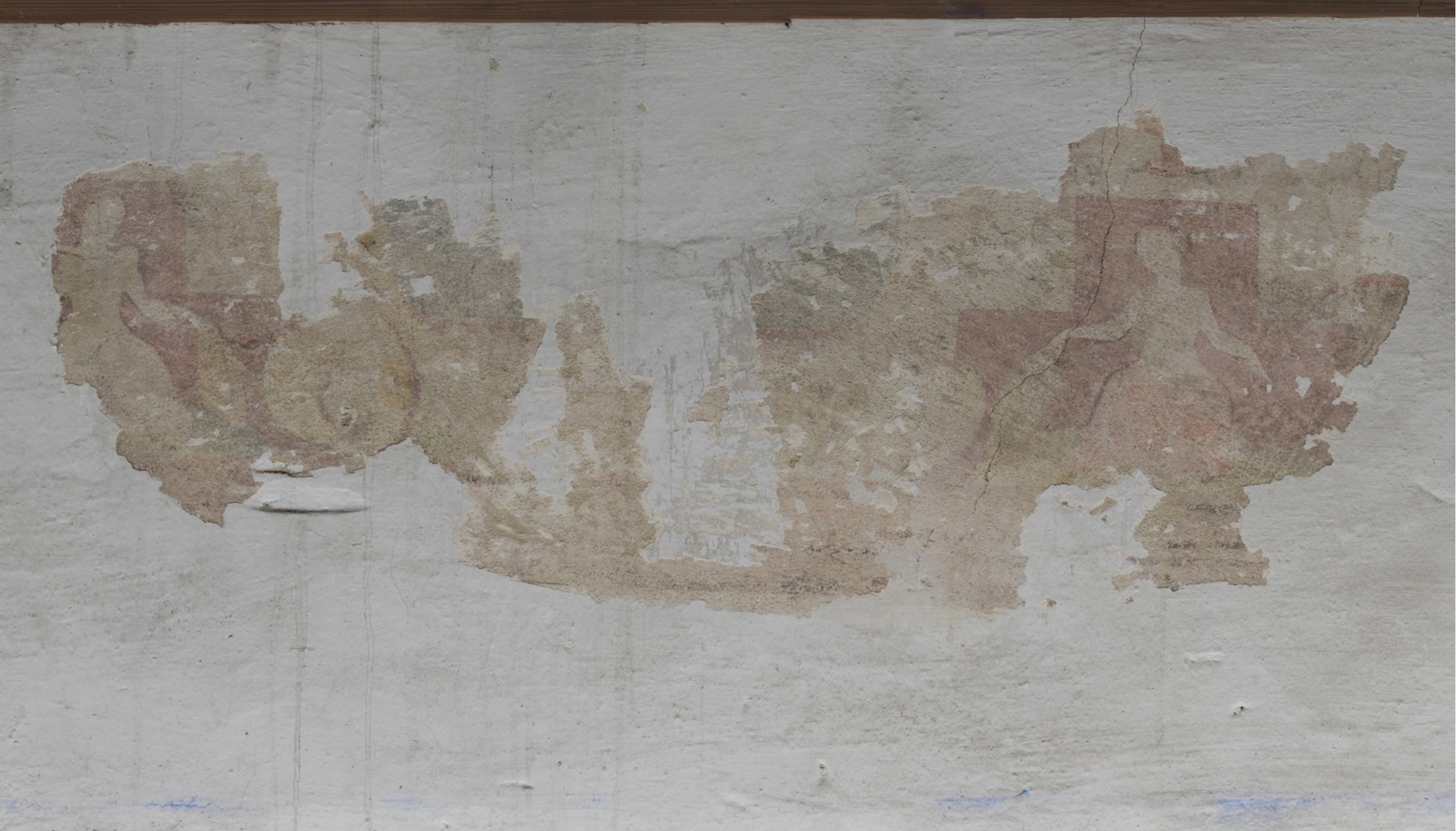Découvert lors d’une opération d’analyse du bâtiment, sûrement avant 2016, le décor peint ceint toute la pièce du 2nd niveau du bâtiment classé monument historique.