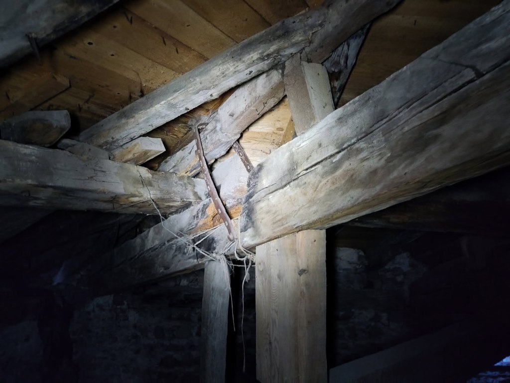 Les tuiles de couverture sont disjointes, cassées ou manquantes. Le système d’évacuation des eaux est inefficace, et les débords de toiture ne protègent plus les façades. Les infiltrations touchent directement la charpente, les planchers et les murs.