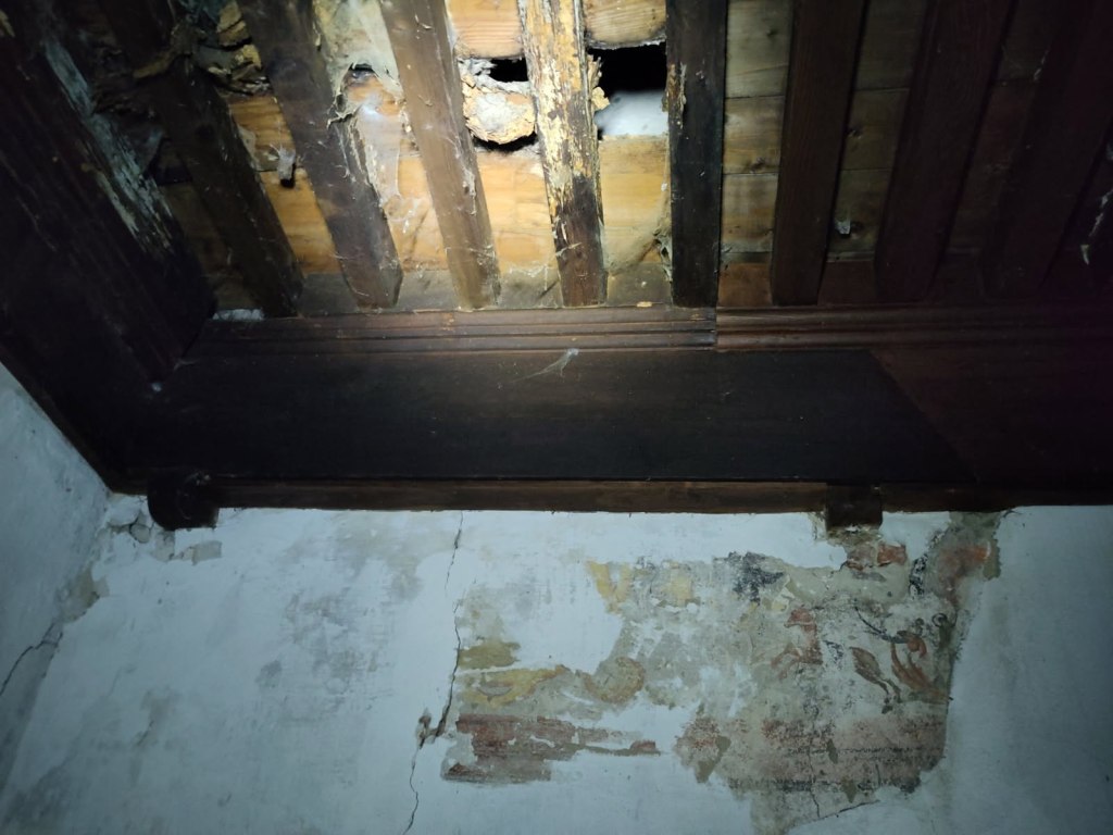 Les fresques murales du XVe siècle, situées à l’étage supérieur, sont en péril. Elles sont un vestige unique de la Cité de Pérouges, véritable trésor du passé. L’humidité s’infiltre à travers la toiture et les murs, dégradant lentement mais sûrement ces éléments uniques du patrimoine artistique médiéval